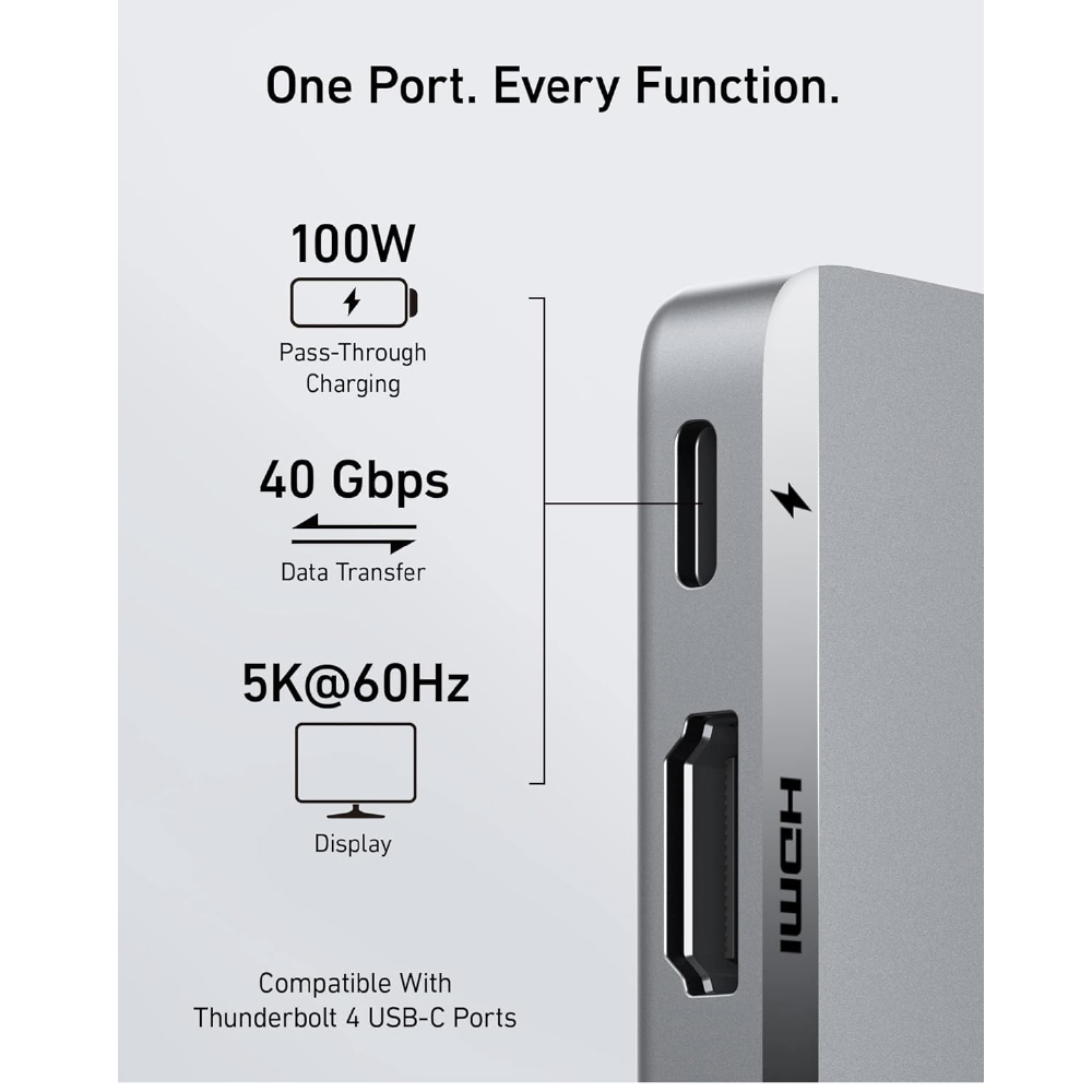 Expansión masiva: aproveche al máximo el puerto USB-C de su computadora portátil, con HDMI 4K a 30 Hz, conectividad para tarjetas SD, puertos de datos USB-A/USB-C y carga de paso de alta velocidad con Power Delivery.