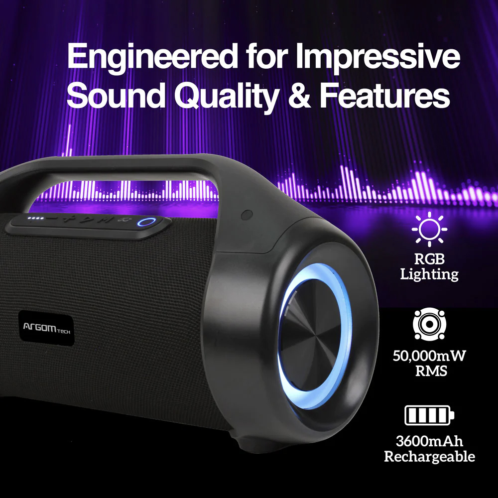 El Radyon+ Beats cuenta con 50 W de sonido potente, una clasificación IPx5 resistente al agua, un mango premium integrado e incluye impresionantes efectos de iluminación. Construido con los últimos chipsets y BT V5.1. Esto permite un sonido excelente e integra la tecnología TWS para poder emparejar dos altavoces para un sonido estéreo. Puedes disfrutar de la música de forma inalámbrica a través de un BT, la entrada auxiliar tradicional de 3,5 mm, o a través de tus archivos de música almacenados en una unidad USB.
