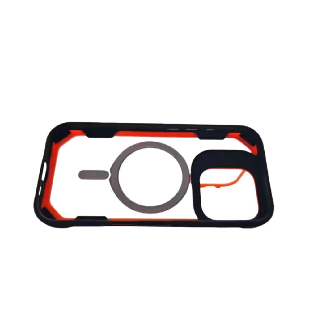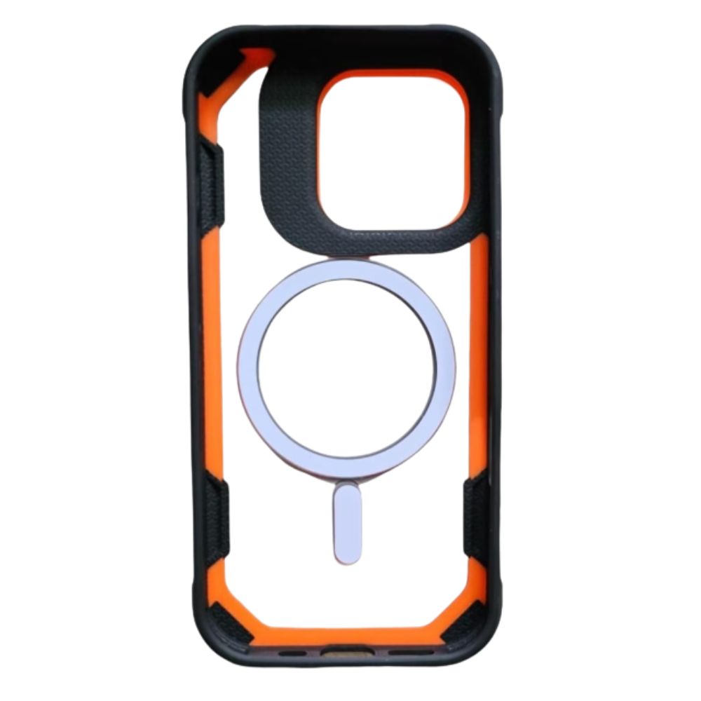 Funda protectora de alta resistencia diseñada para el iPhone 15 Pro Max. Compatible con MagSafe y con refuerzo en la zona de la cámara color naranja. Ofrece máxima protección contra caídas y rayaduras, manteniendo un diseño moderno, delgado y funcional.