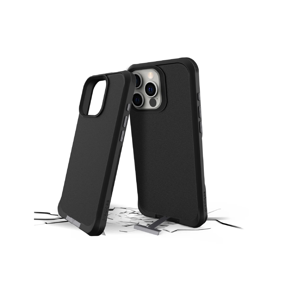 Diseñado con un pie de apoyo colocado discretamente hecho de aleación de aluminio de alta calidad que sostiene firmemente su teléfono en posición vertical. Imanes incorporados discretamente diseñados para carga inalámbrica. Esta funda resistente brinda protección integral con parachoques que absorben los golpes. Agarre firme en todos los sentidos y material de acabado suave con un bisel elevado para ayudar a proteger la lente de la cámara contra rasguños.